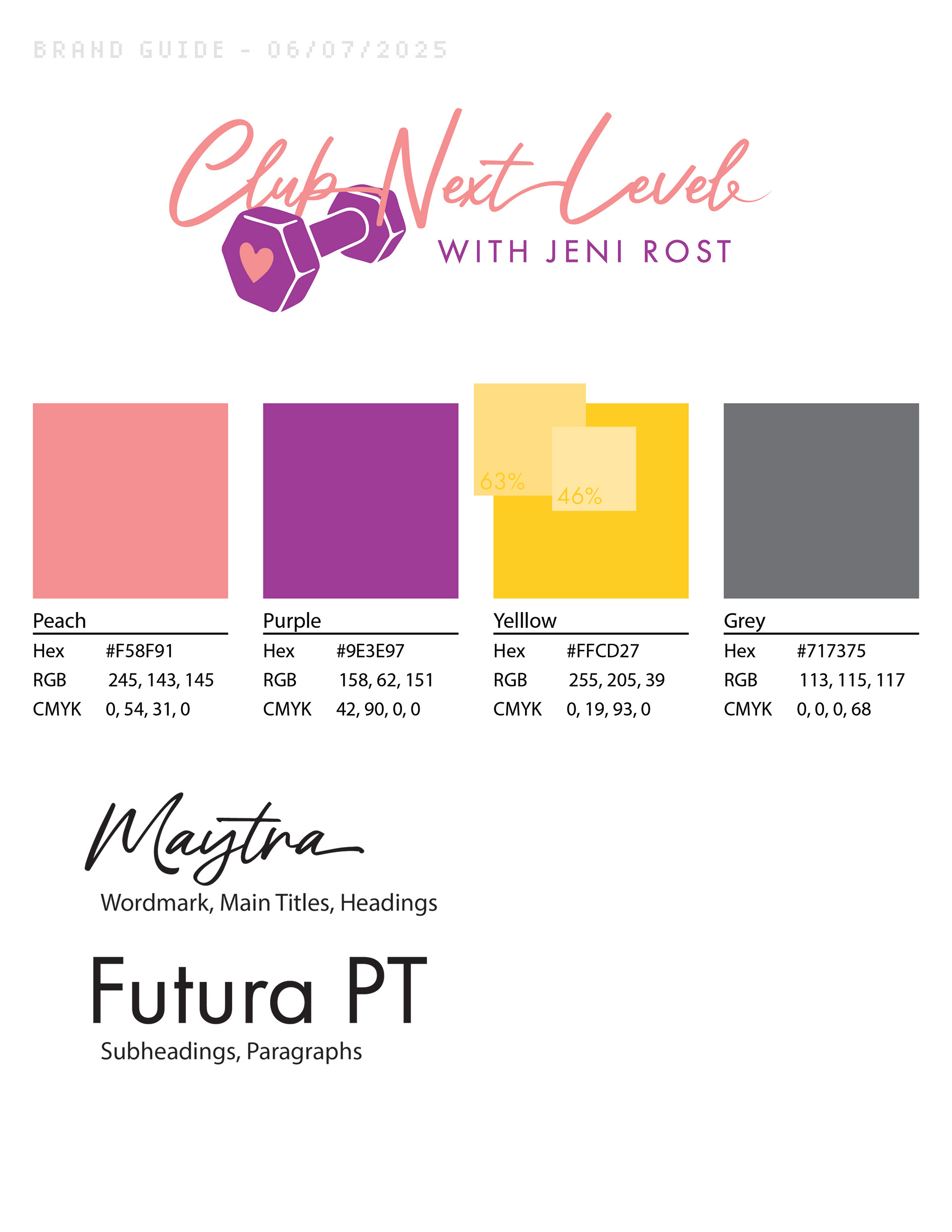 We went with a pinky-peach, warm purple, goldenrod, and a cool grey to bring balance to the branding. Intensity is played with in later designs, so I showed this in the brand guide with the yellow - showing 63% and 46% variations.
